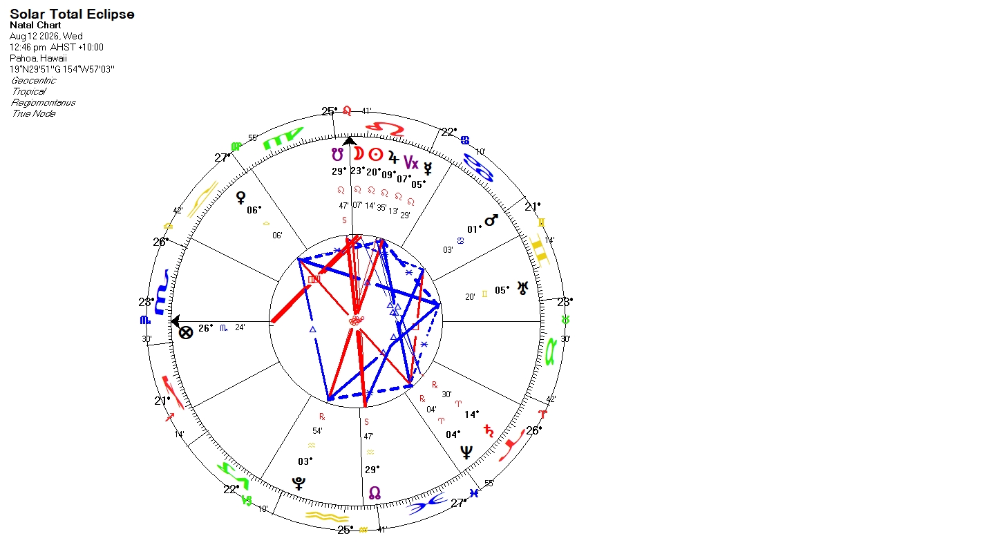 The chart for the August 12 Solar Eclipse in Leo features a grand trine in Air signs, and trines in Fire signs between Mercury and Jupiter in Leo to Neptune and Saturn in Aries. Neptune stations retrograde on July 7 in sextile aspect to Pluto. Saturn also stations retrograde on the 26th. Mercury stations direct in Cancer on July 24, in a square aspect to Saturn. This is our warning to secure water and be prepared for drought season, and to be attentive to periods of high winds. Events starting from this emphasis on Air and Fire start in a flash!! They are life-changing influences. Sudden and Unexpected.